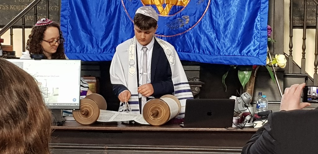 October 2021. Following our September meeting with the Liberal Jews, David Griffiths (Chair) was invited to a Bar Mitzvah ceremony at Colegate when a 13 year old boy (photo) had to read a portion of the Torah scroll in Hebrew to become an adult. He read about Noah and the rainbow promise from God and then did a speech in English on the need for looking after the earth and climate change, saying he was giving 10% of his Bar Mitzvah gifts to a climate charity.