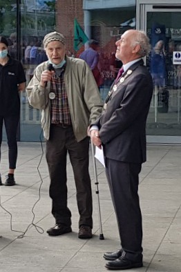 I attach photos of Shan, when he spoke to us on Zoom in November 2021, and at the September Peacecamp in the Forum with the Mayor, which he organised and which was dear to his heart. Our sympathies, prayers and gratitude for his life and love go to his family and community at this time.